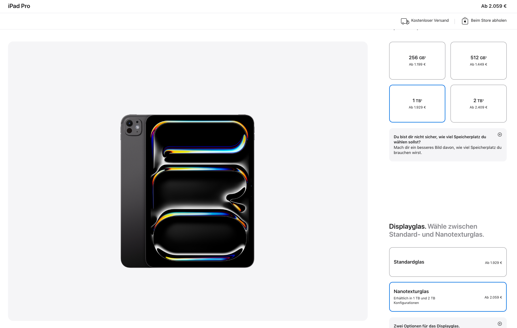 - Mit 1 bzw 2 TB gibt es iPads mit 16 GB RAM und 10 CPU-Kernen. Uuuuund, ihr koennt euch fuer 130 Euro Aufpreis das Nanotexturglas goennen