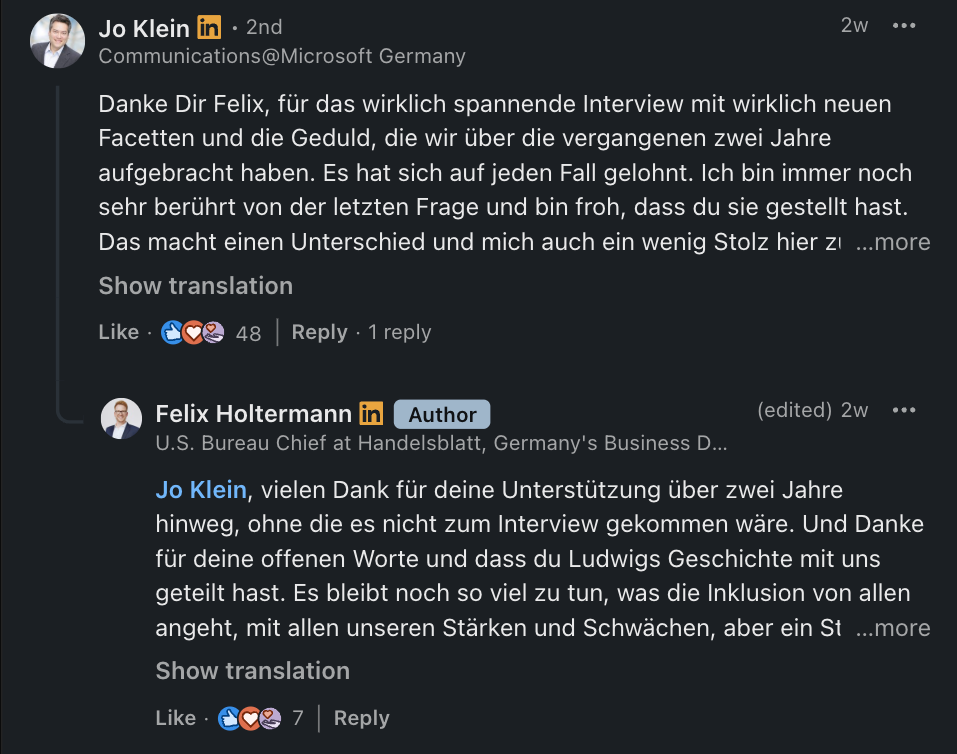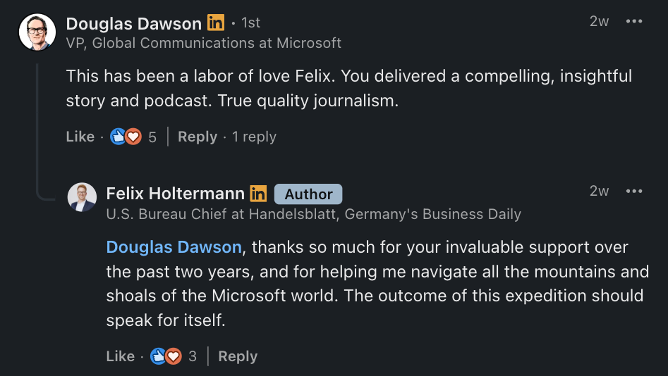 Und dann dieses Interview im Handelsblatt. Eine reine PR-Nummer. Keine kritischen Fragen, nichts. Und in den Kommentaren auf LinkedIn? 80% Microsoft-Mitarbeiter, die sich selbst abfeiern. Das ist Realitaetsverweigerung.