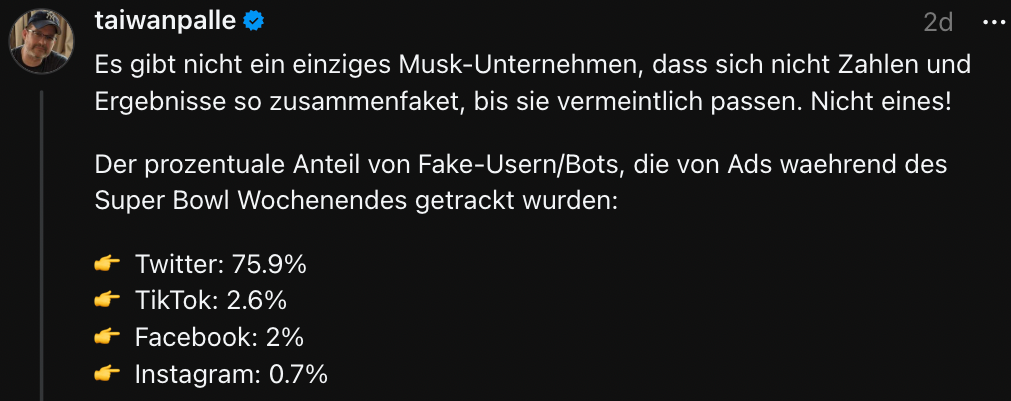 "One-time “Twitter Files” journalist Matt Taibbi stepped up his feud with Elon Musk Thursday by sharing screenshots of a conversation they’d had in which the billionaire told him frankly: “You are dead to me.”" - Majority of Twitter-traffic may have been fake during the Super Bowl