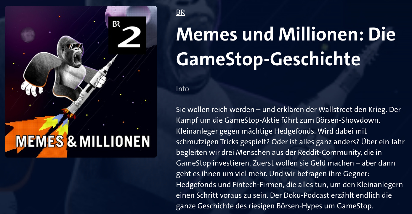 Den Game-Stop Meme-Stock Hype so aufzuarbeiten… Hut ab, Hut ab und noch einmal Hut ab. Dass dies auch ueber die Mediatheken gepusht wird zeigt einmal mehr, wie wichtig die Oeffis fuer unsere Medienlandschaft sind. Danke an alle Beteiligten und schoen, dass ihr euch fuer diesen wunderbaren Beruf entschieden habt!
