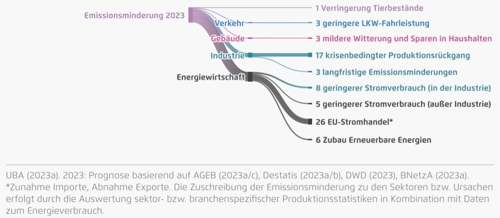 Letztendlich waren die Hauptfaktoren fuer den Rueckgang der Emissionen Veraenderungen in der Stromhandelsbilanz der EU, die sich in geringeren Exporten und hoeheren Importen niederschlugen. Aber auch, und das muessen wir ganz klar benennen (oh oh Deindustrialisierungs-Alarm!) Produktionsrueckgaenge, vor allem in der energieintensiven Industrie, sowie Einsparungen im Strom- und Gasverbrauch.