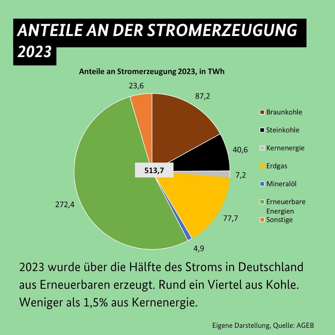 2023 kam mehr als die Haelfte des Stroms in Deutschland aus erneuerbaren Energiequellen. Daten, Diagramme und Fakten zur Energiewende, die immer mehr zur Erfolgsgeschichte wird!