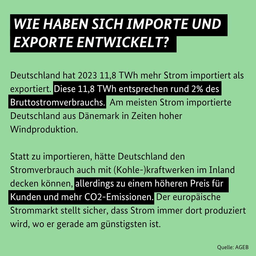 Das ist unter anderem eine Folge des Kernkraft-Ausstiegs, aber auch des steigenden CO2-Preises, der deutsche Kohlekraftwerke unrentabler gemacht hat. Statt dessen laufen jetzt häufiger umweltfreundlichere Kraftwerke im Ausland. Sowohl die deutschen Stromimporte als auch die -exporte kamen 2023 überwiegend aus erneuerbaren Quellen. Quelle