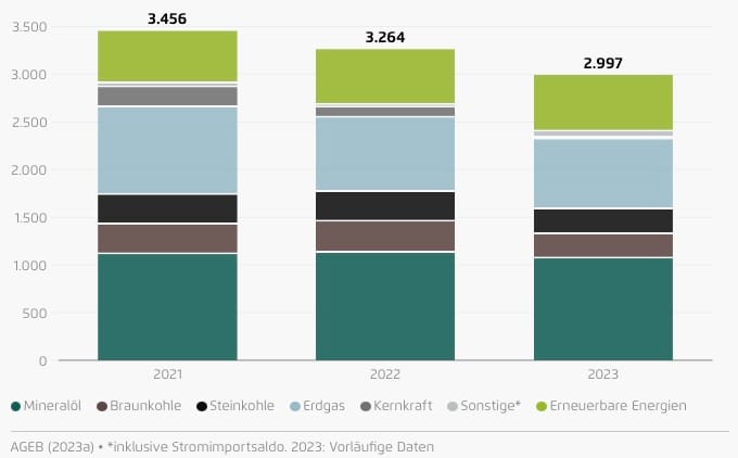 Und um das Ganze in Zahlen zu packen: Der Primaerenergieverbrauch hat sich 2023 auf insgesamt 2.997 Terawattstunden (TWh) eingependelt.