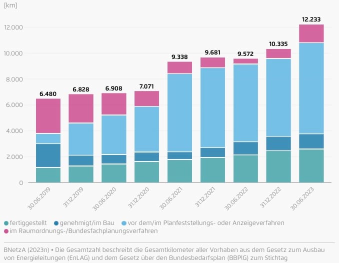 Aber wie sieht's in der Realitaet aus? Naja, es gibt Licht und Schatten. Im ersten Halbjahr 2023 wurden gerade mal 127 Kilometer neue Stromleitungen in Betrieb genommen – ein Tropfen auf den heissen Stein. Aber, und jetzt kommt der Lichtblick, im gleichen Zeitraum wurden Genehmigungsverfahren fuer Projekte mit einer Gesamtlaenge von 1.950 Kilometern angekurbelt. Zum Vergleich: Im Halbjahr davor waren es nur 114 Kilometer. Das ist ein ziemlicher Sprung nach vorne und ein Zeichen dafuer, dass die Dinge endlich ins Rollen kommen.