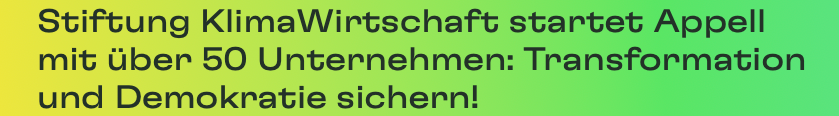 Über 50 deutsche Unternehmen haben sich heute in einem gemeinsamen Appell auf Initiative der Stiftung KlimaWirtschaft an die Politik gewendet. In dem Papier mit dem Titel „Die Transformation als Jahrhundertprojekt” bekennen sich die Unternehmen zum Standort Deutschland und den Klimazielen. Gleichzeitig betont der Aufruf, dass rechtsextreme Kräfte die Demokratie und die wirtschaftliche Leistungsfähigkeit Deutschlands bedrohen. Quelle