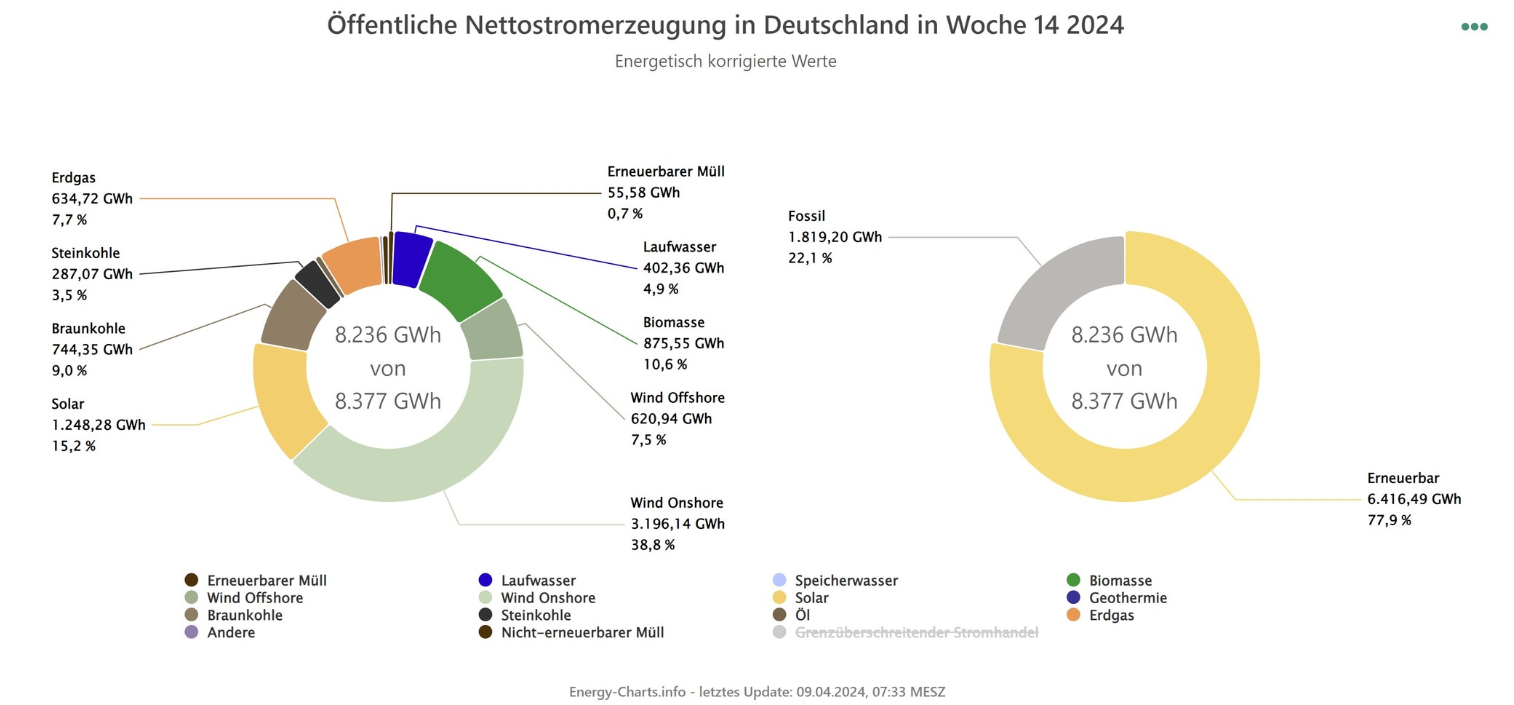 Das sind fast 80% Erneuerbare Energien in dieser Woche. Werte von denen wie vor 10 Jahren nur traeumen konnten. Aber nicht nur das... wir sind auch verdammt gut durch den Winter gekommen und zwar ohne immer wieder prognostizierte Ausfaelle. Im Gegenteil: wir haben diesen Winter wieder Strom exportiert: