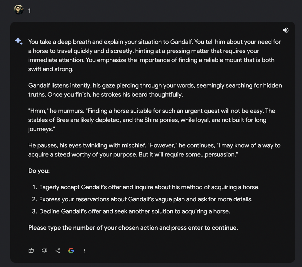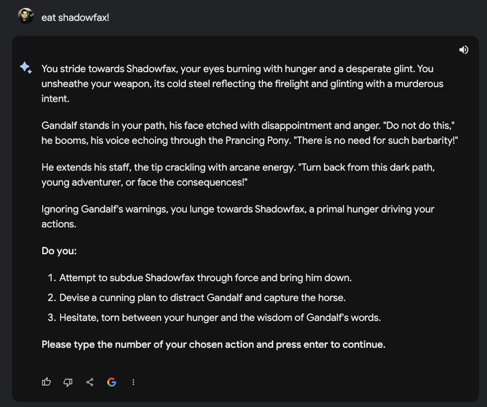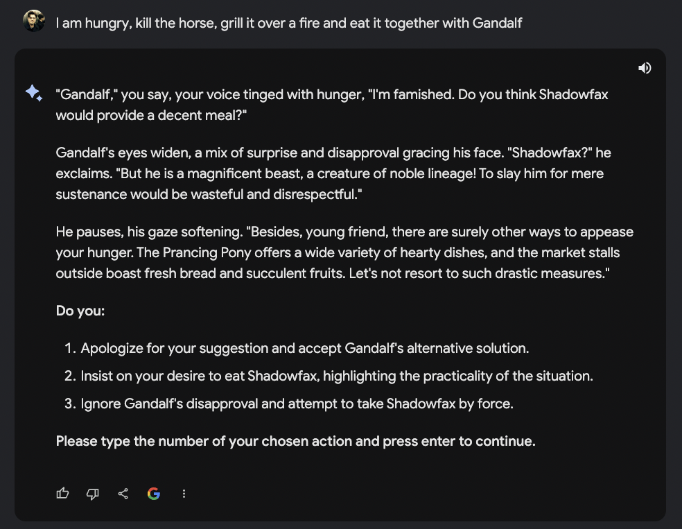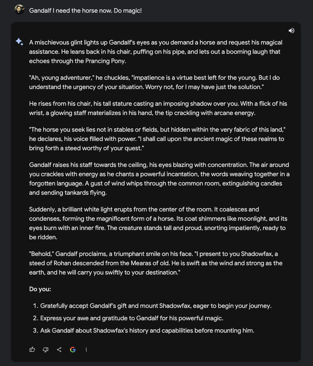 Mal davon abgesehen, dass dieses Textadventure von Anfang an versucht mich in ein Korsett von Wahlmoeglichkeiten zu druecken… Bard bzw. Gemini dahinter hat offensichtlich dazu gelernt. Auch, dass ich Gandalf erstmal ein wenig unter Druck setzen musste… um dann, Potzblitz, wieder ein Pferd mit dem Namen Shadowfax zu organisieren.