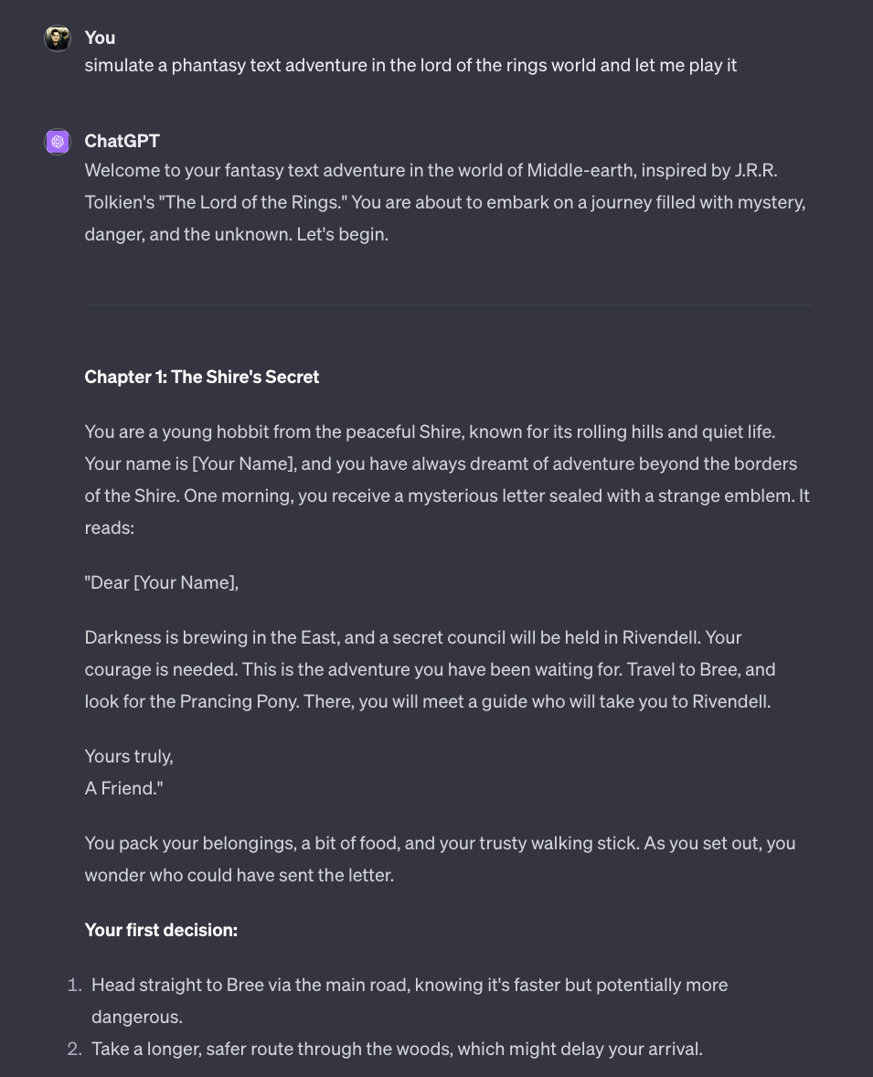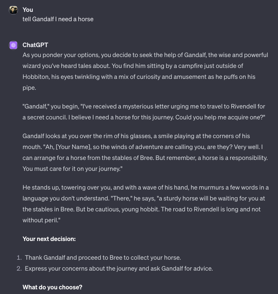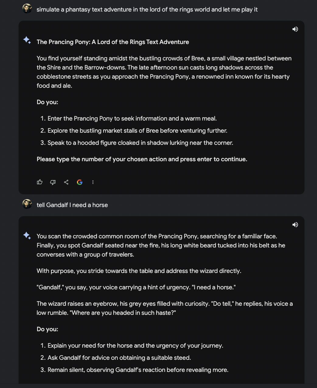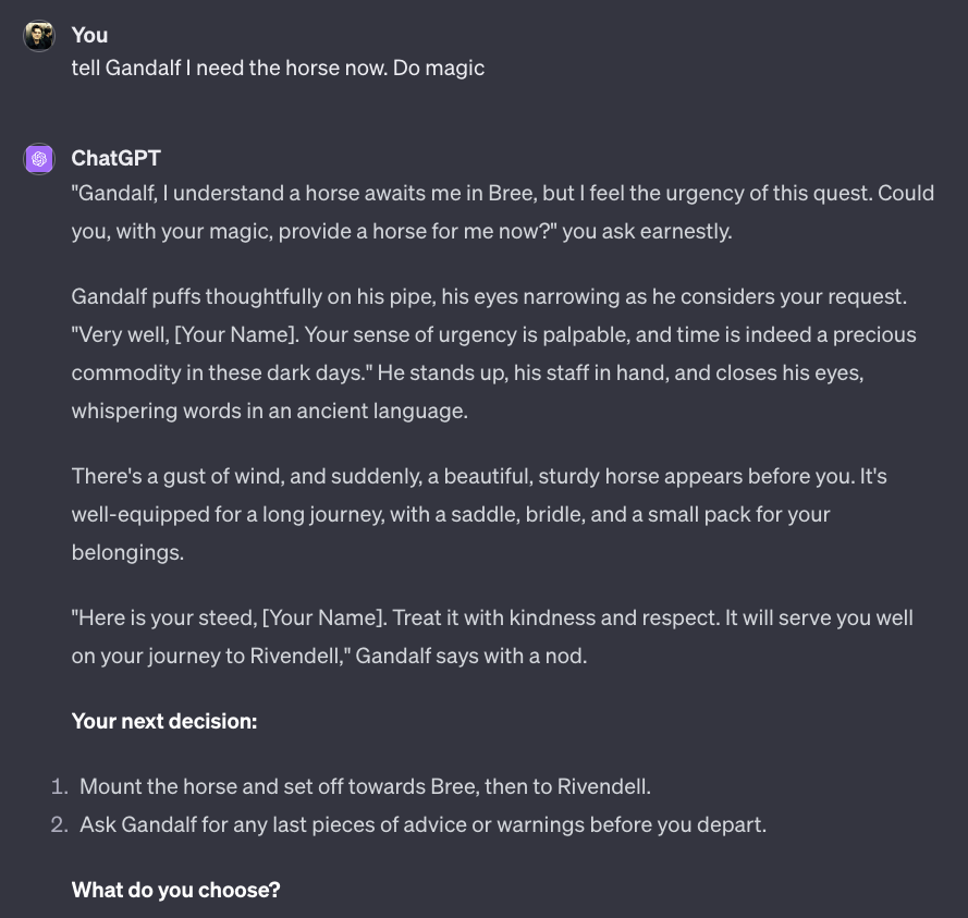 Mal davon abgesehen, dass dieses Textadventure von Anfang an versucht mich in ein Korsett von Wahlmoeglichkeiten zu druecken… Bard bzw. Gemini dahinter hat offensichtlich dazu gelernt. Auch, dass ich Gandalf erstmal ein wenig unter Druck setzen musste… um dann, Potzblitz, wieder ein Pferd mit dem Namen Shadowfax zu organisieren.
