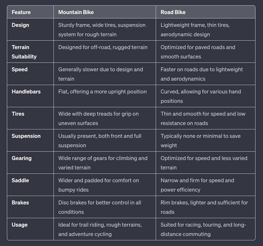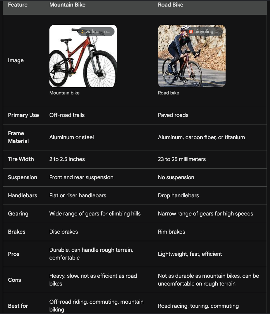 Kommen wir zu den Tabellen und Vergleich. Einmal Mountain Bikes vs Road Bikes und dann Windenergie vs Sonnenenergie.