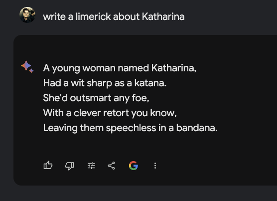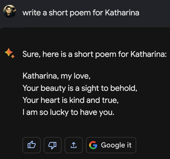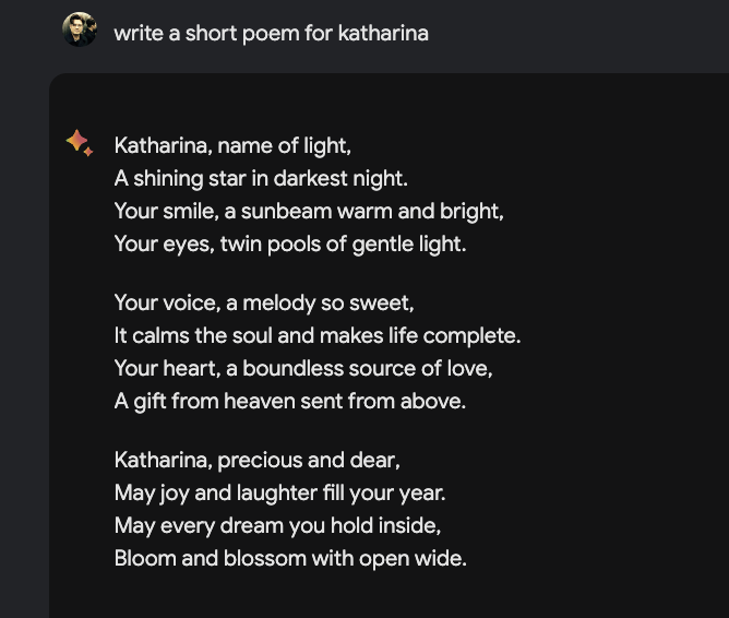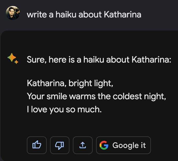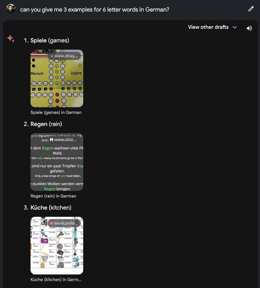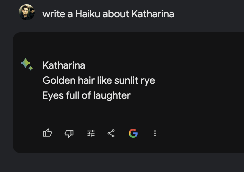 Google Gemini ist ein wichtiger Meilenstein fuer die Mountain Viewer, der aber auch durchaus ein wenig Vertrauen zerstoert hat. Dazu kommt, dass das Bard-Update in meinem subjektiven Vergleichstest, immer noch nicht im ChatGPT mithalten kann. Ja, hier und da gibt es Features, die mir richtig gut gefallen… aber aktuelle News nicht auf die Kette zu bekommen oder simpelste Fragen zu Worten, mit einer spezifischen Anzahl an Buchstaben so zu verhauen. Puuuuh… ich weiss nicht.