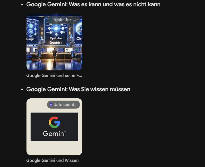 Spannend dabei: Bard pustet auch noch gleich begleitende Artikel mit Vorschaubildern und Links aus… um sich ein wenig inspirieren zu lassen. Tatsaechlich aktuell und das halte ich fuer ein tolles, ergaenzendes Feature!