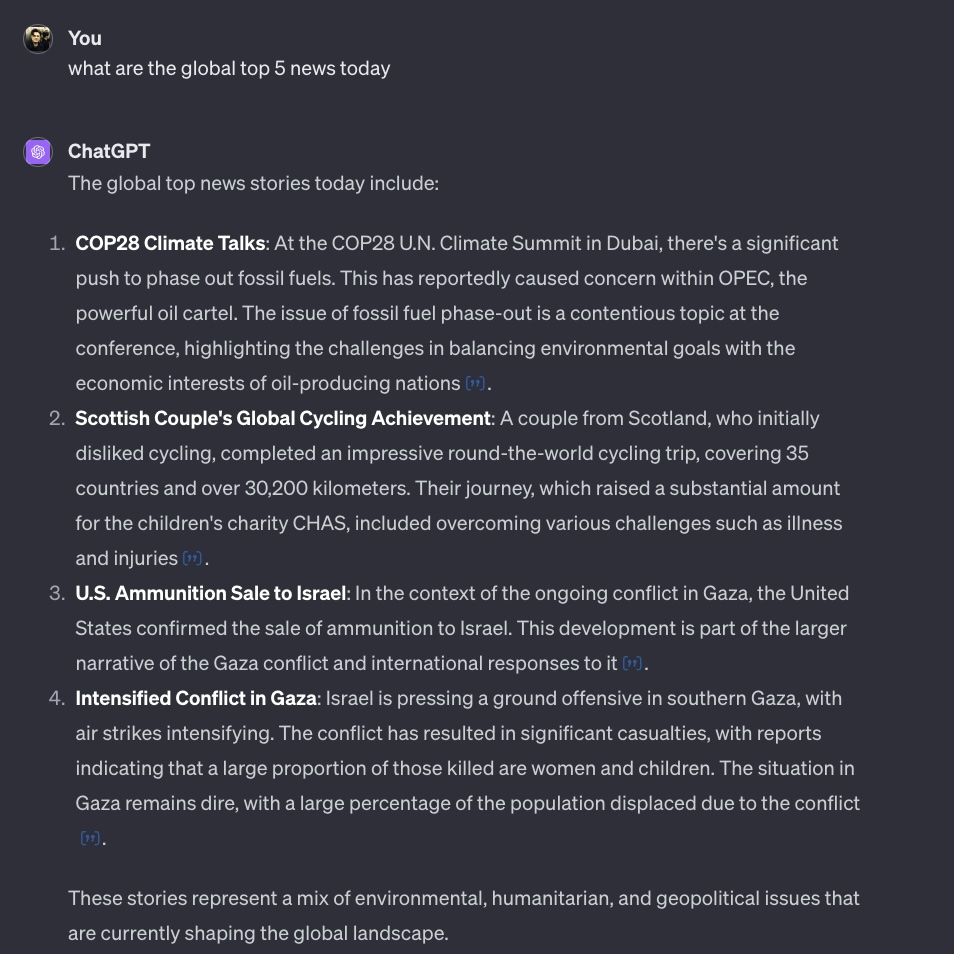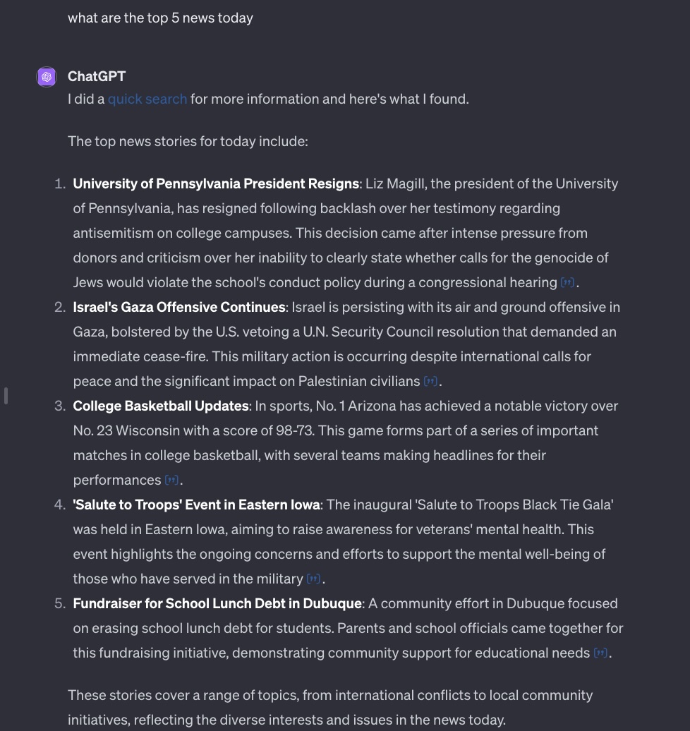 Der OpenAI-Bot geht erstmal davon aus, dass mich US News interessieren wuerden. Auf Nachfrage passt dann aber alles… und es werden sogar noch Links zu den Quellen geliefert. Vorbildlich!