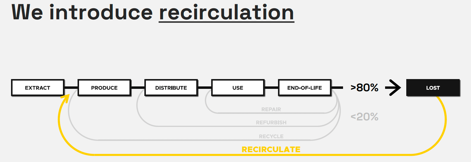 Und genau da setzt das Prinzip der Recirculation an! Wie bekommen wir diese Materialien wieder in die Wertschoepfungskette geschoben... und zwar nicht nur auf dem Papier, sondern transparent fuer alle nachvollziehbar!