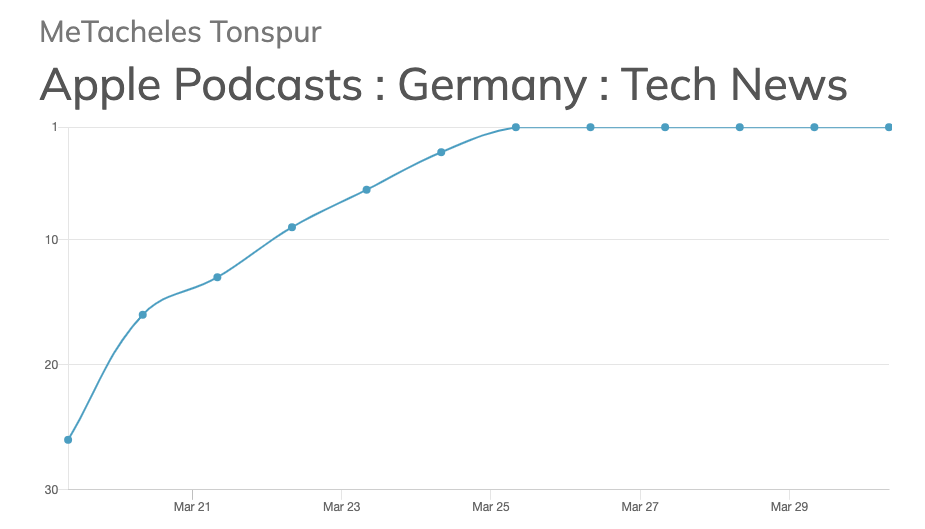Und jetzt schiesst der eigentlich nur als Begleitung gedachte Podcast-Monolog auf Platz 1 in den Tech-News Charts von Apple Podcast und rankte in den Top 100 aller News-Podcasts in Deutschland fuer einige Zeit vorm Podcast der Tagesthemen. WTF?!