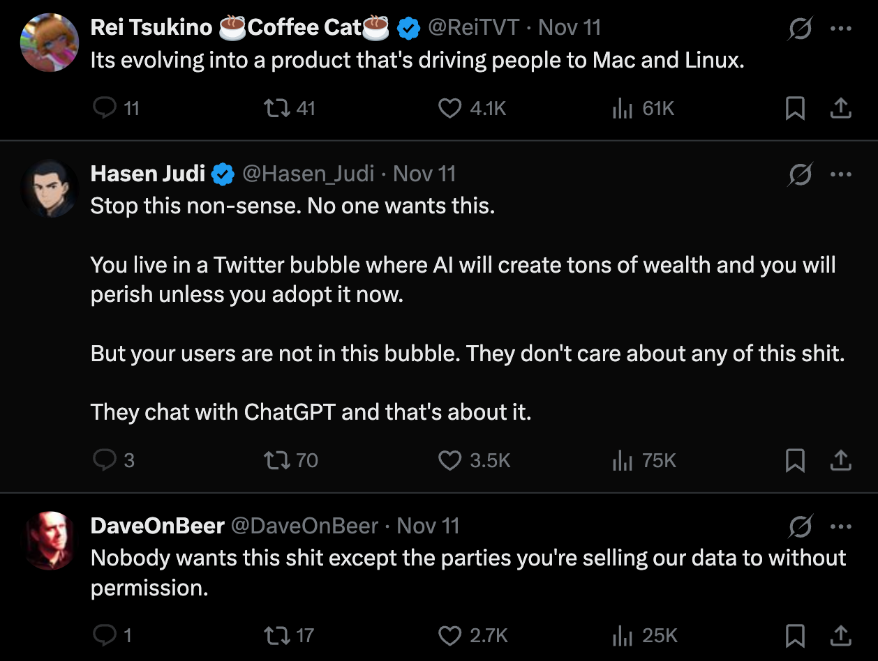 Das ist dieser typische Silicon-Valley-Tunnelblick. Die leben in ihrer Blase, in der KI das Allheilmittel fuer alles ist, und vergessen dabei voellig, dass da draussen Menschen sitzen, die einfach nur arbeiten wollen. Ohne Recall-Spyware, die alle paar Sekunden Screenshots macht. Ohne Telemetrie, die Gigabytes an Daten nach Redmond funkt.