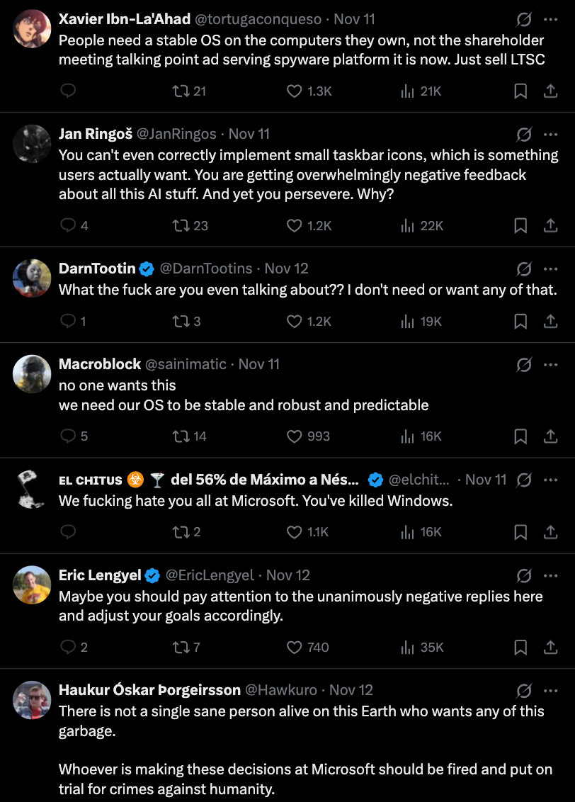 Und dann kommen Leute wie Pavan Davuluri (Microsofts Windows-Chef) um die Ecke und twittern was von "Agentic OS" und "intelligenter Produktivitaet". Die Antwort der Community darauf war so brutal wie ehrlich: Niemand will das. Wir wollen einfach nur ein verdammtes Startmenue, das aufgeht, wenn man draufklickt!
