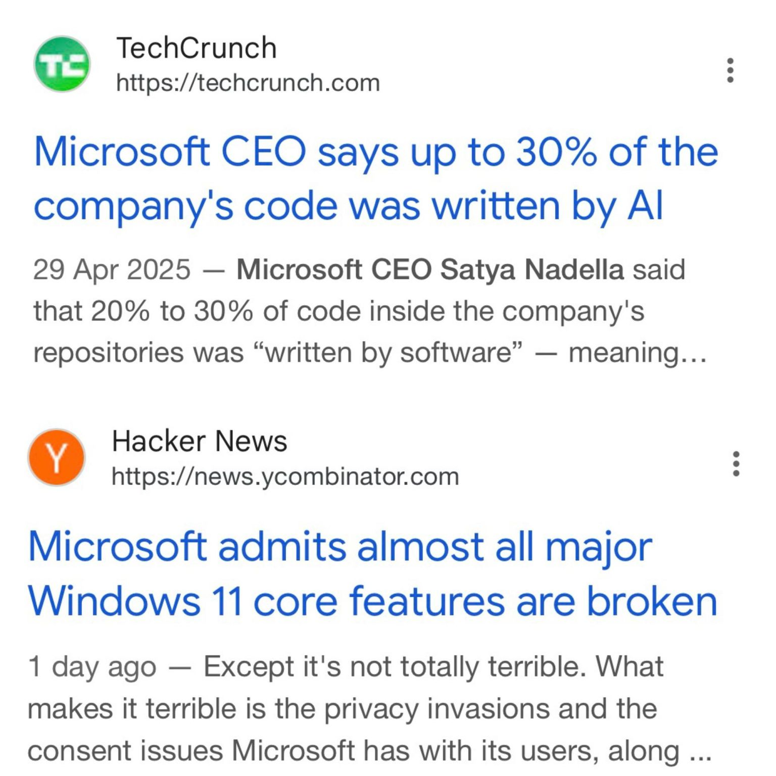 Satya Nadella prahlte im April 2025 damit, dass 20–30 % des Windows-Codes inzwischen von Maschinen geschrieben wird. Und ploetzlich ergibt alles Sinn: Ein Betriebssystem, das sich anfuehlt wie ein technisches Experiment – instabil, ueberladen, werbeverseucht und voller Telemetrie!