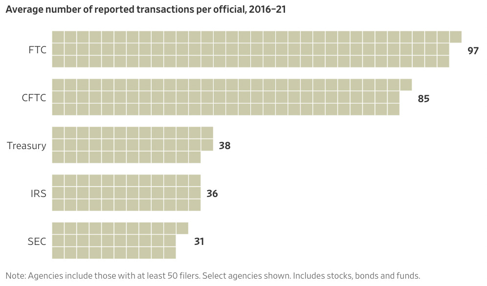 Bleibt die Frage, ob die Story rund um Insidertrading bei der US-FTC Behoerde diese Geschichte noch toppt? Wenn sich Regulator:innen, die sich u.a. mit Uebernahmen und Firmenzusammenschluessen beschaeftigen am Kapitalmarkt bedienen, dann ist das erstmal kein Problem. Oder? Natuerlich ist es das, denn letztendlich haben sie hier nicht nur einen Wissensvorsprung, sondern werden der ethisch-moralischen Verantwortung des Amtes nicht gerecht. Wirklich eine grossartige Story des Journals!