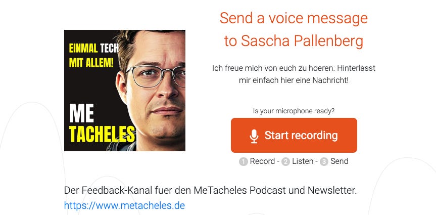 Ja, ihr koennt nun auch Teil vom MeTacheles Podcast und dem Newsletter werden. Wie? Einfach auf diesen Link https://t.ly/hallo klicken, kurze Sprachnachricht hinterlassen und dann geht es ab in die naechste Ausgabe!