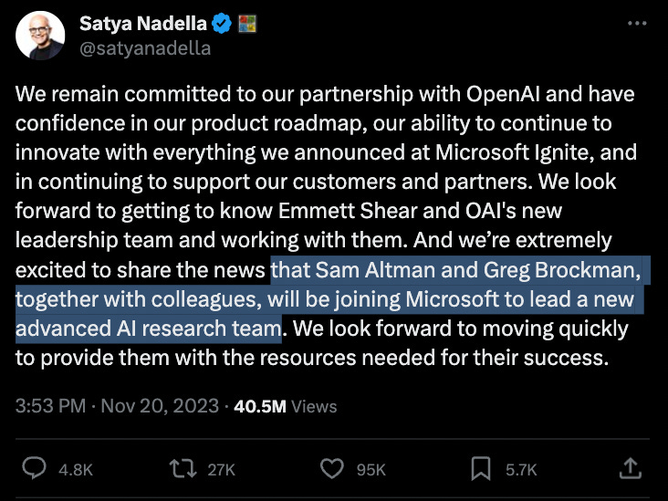 “One thing I’ll be very, very clear [about] is, we’re never going to get back into a situation where we get surprised like this ever again. If we go back to operating like on Friday, we will make sure we are very, very clear that the governance gets fixed in a way that we really have more surety and guarantee that we don’t have surprises.” - Satya Nadella