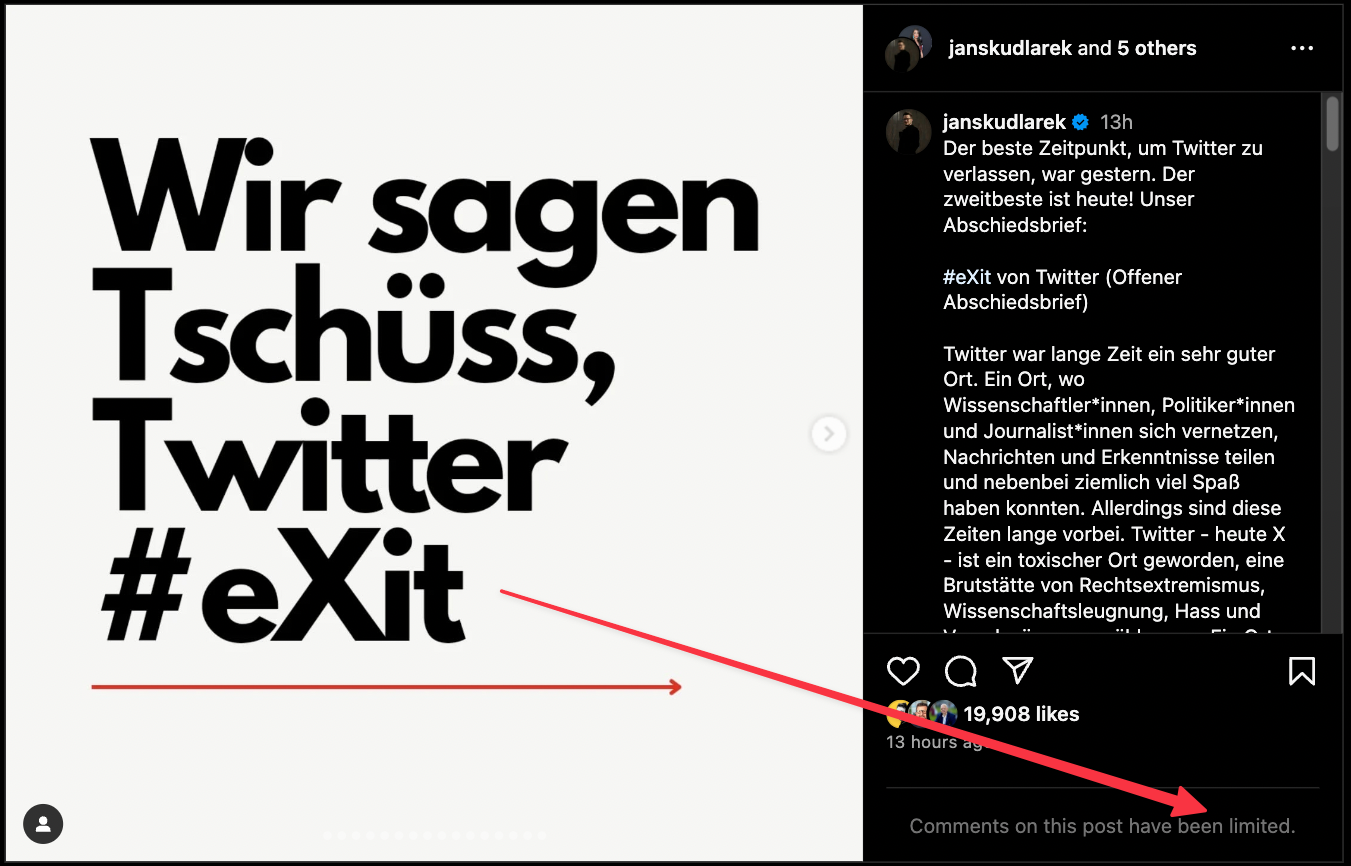 Mit viel TamTam, DPA-Mitteilung und unkommentierbaren Instagram-Postings verlassen reichweitenstarke Twitter-Accounts die Plattform und springen in ihrer unreflektierten Selbstgefaelligkeit in die naechste Algorithmen-Falle. Ein Rant!