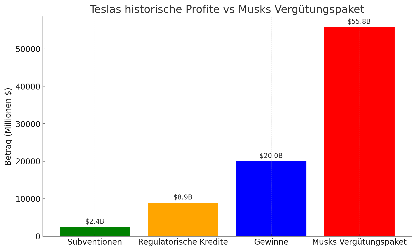 - Musks Verguetungspaket: Das Kompensationspaket von Elon Musk, das 2018 genehmigt wurde, hat einen Wert von bis zu 55,8 Milliarden Dollar, was deutlich die kumulativen Gewinne und regulatorischen Kredite von Tesla zusammen uebertrifft.