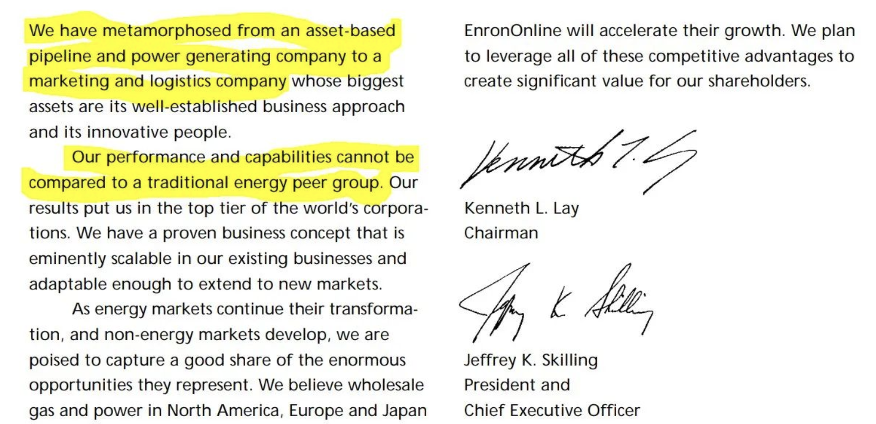 Aber woher kommt eigentlich dieser Enron-Vergleich und funktioniert der ueberhaupt? In seinen letzten Zuegen, also wirklich wenige Quartale bevor das Enron-Kartenhaus einstuerzte, erklaert die Firma Unglaubliches: Man wolle nun keine Energiefirma mehr sein, sondern waere nun ein Marketing- und Logistik-Unternehmen!
