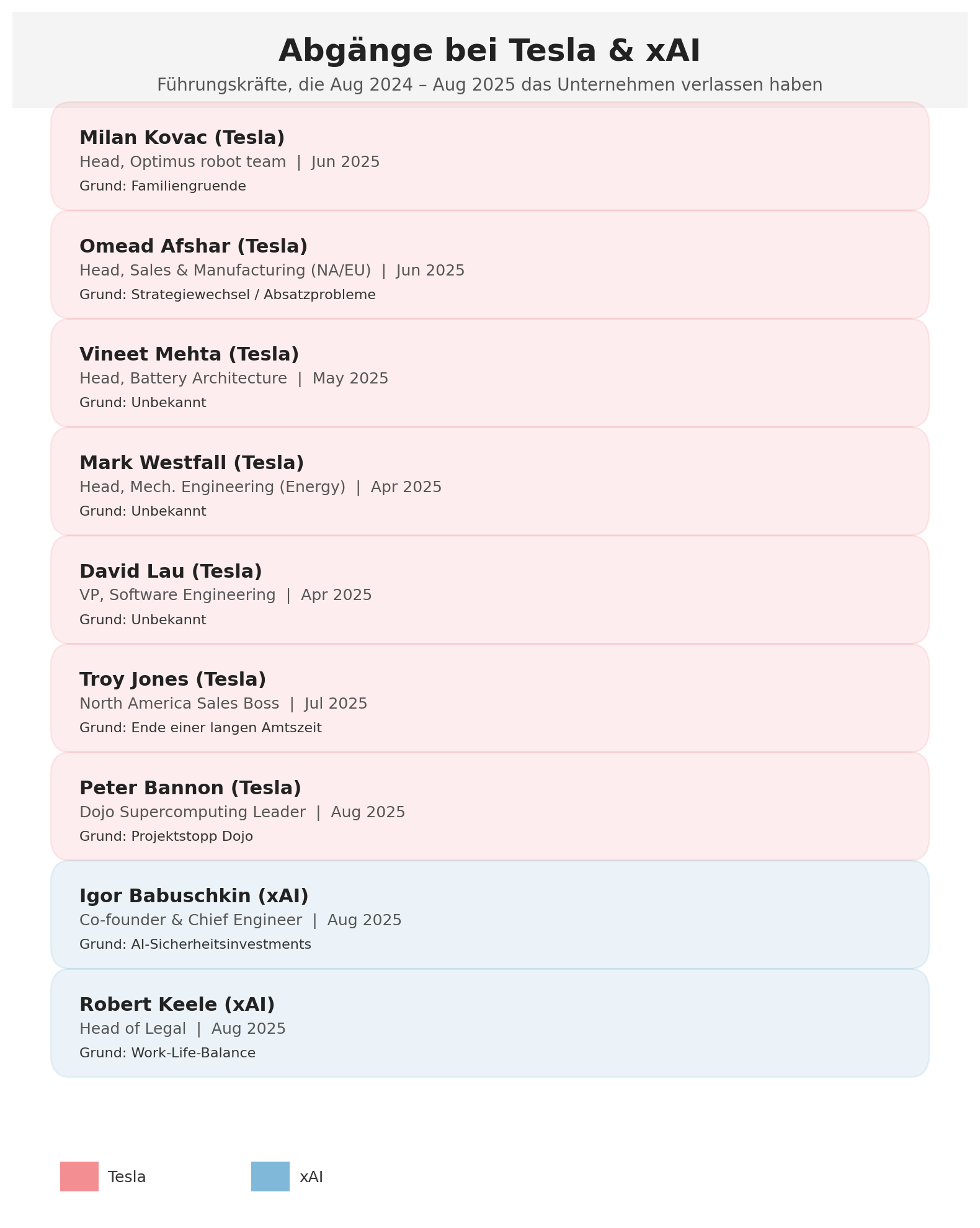 Diese PR-Stunts kommen aber auch intern alles andere als gut an. In den letzten Monaten haben auffallend viele Top-Leute Tesla verlassen. Besonders kritisch: Fuehrungskraefte im Bereich AI und Chipentwicklung. Also genau die Bereiche, von denen Musk tagtaeglich behauptet, dass Tesla hier der fuehrende Treiber ist.