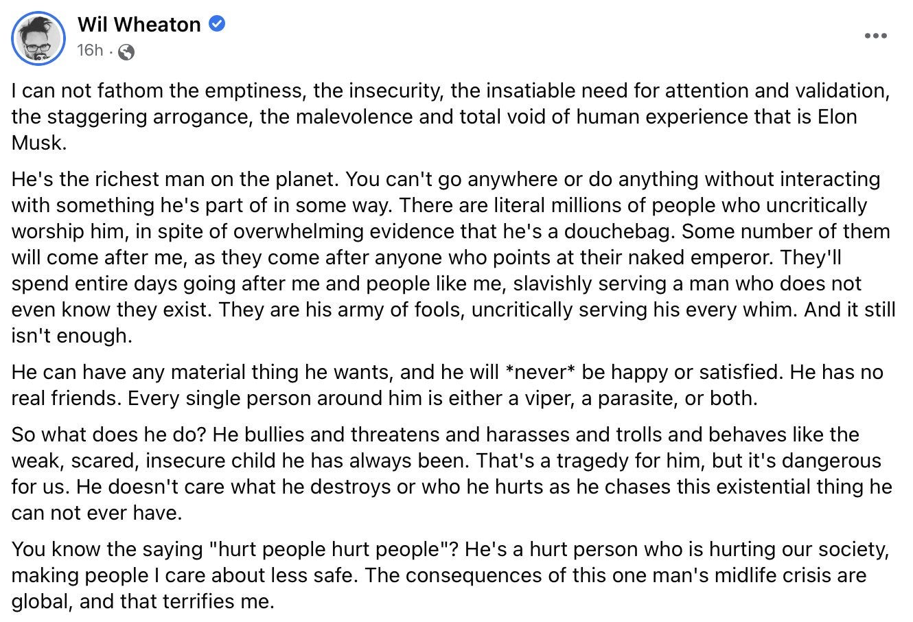 Der wunderbare Wil Wheaton laesst sich auf Facebook ueber Elon Musk aus. Mic Drop der Woche!
